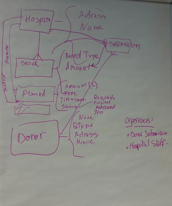 The first step I like to take is that of defining the data model; what are the entities that need to be created to model real-world entities? In this story, things that come to mind are physical entities such as hospitals and clinics, blood storage and inventory. Then I think about the people involved, from the story. I think about medical staff, patients needing the transfusion, donors who will supply their blood, and other admin staff. I consider the activities that need to be performed as these will also need to make up the data model. In line with the story I see the need to make a request for blood, collection of blood, storing of blood, data capture of patient details, data capture of blood types, and data capture of donors.